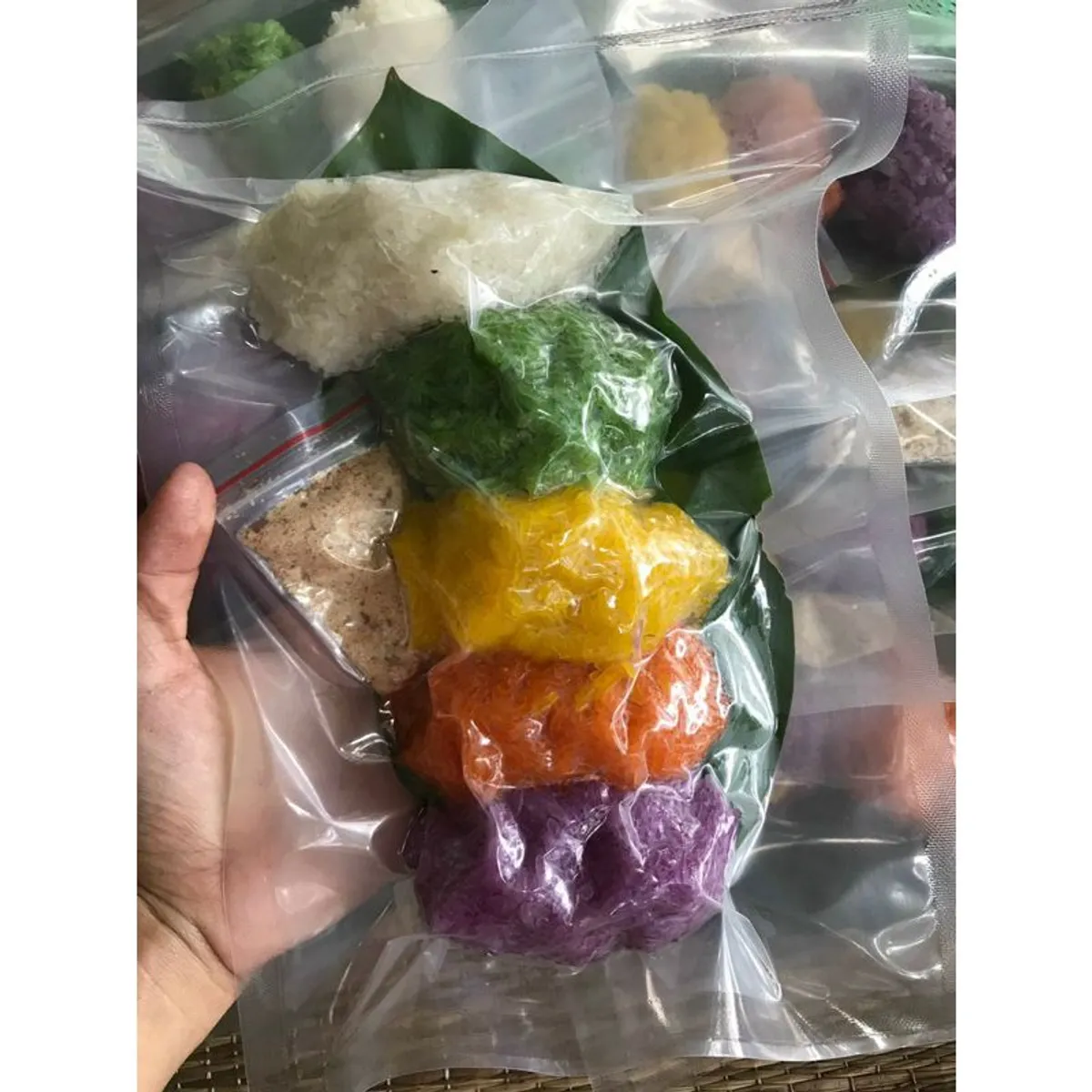 Thành phẩm: Khi xôi chín, từng phần xôi màu sắc được xếp xen kẽ tạo thành một mâm xôi ngũ sắc rực rỡ, hấp dẫn.